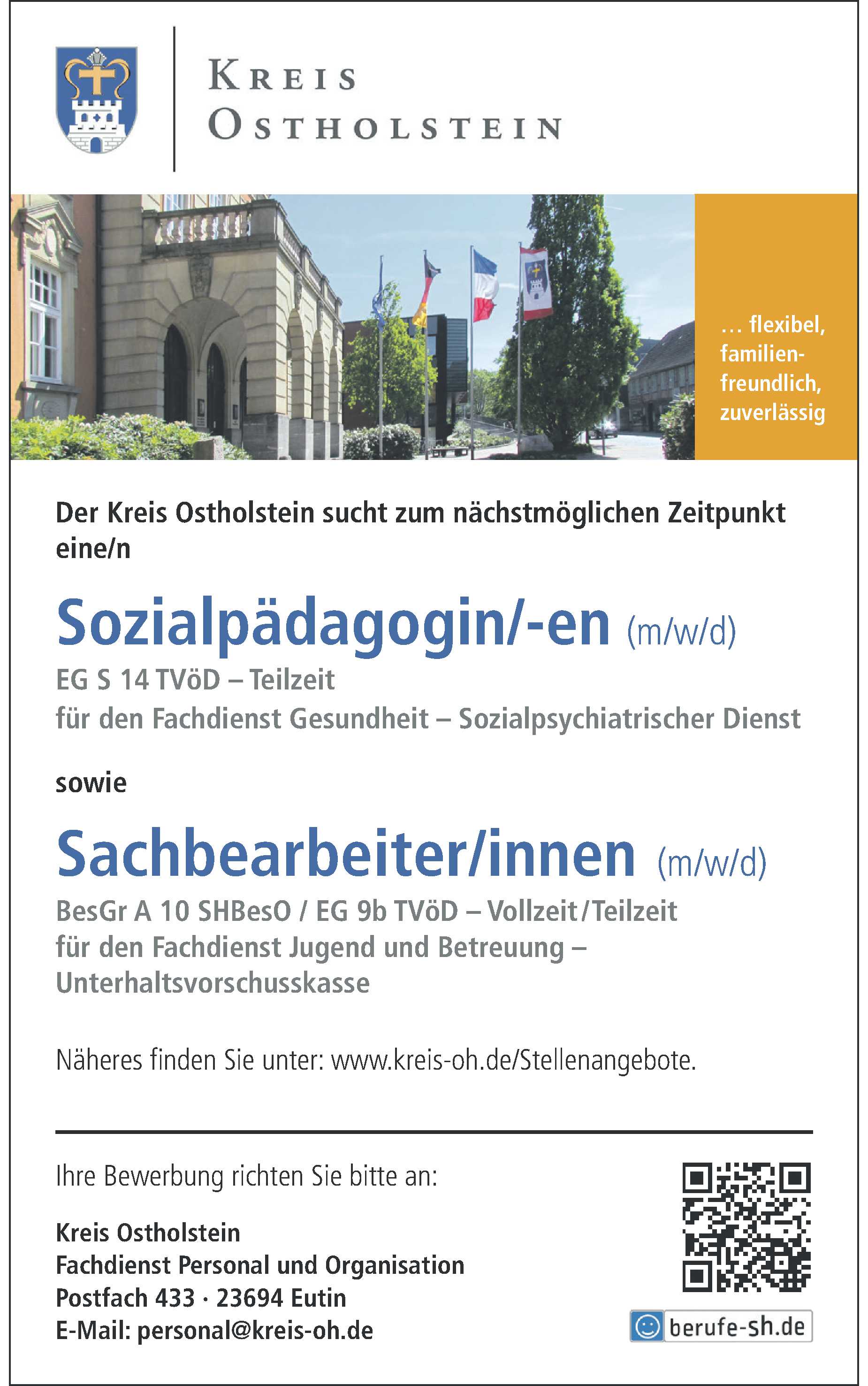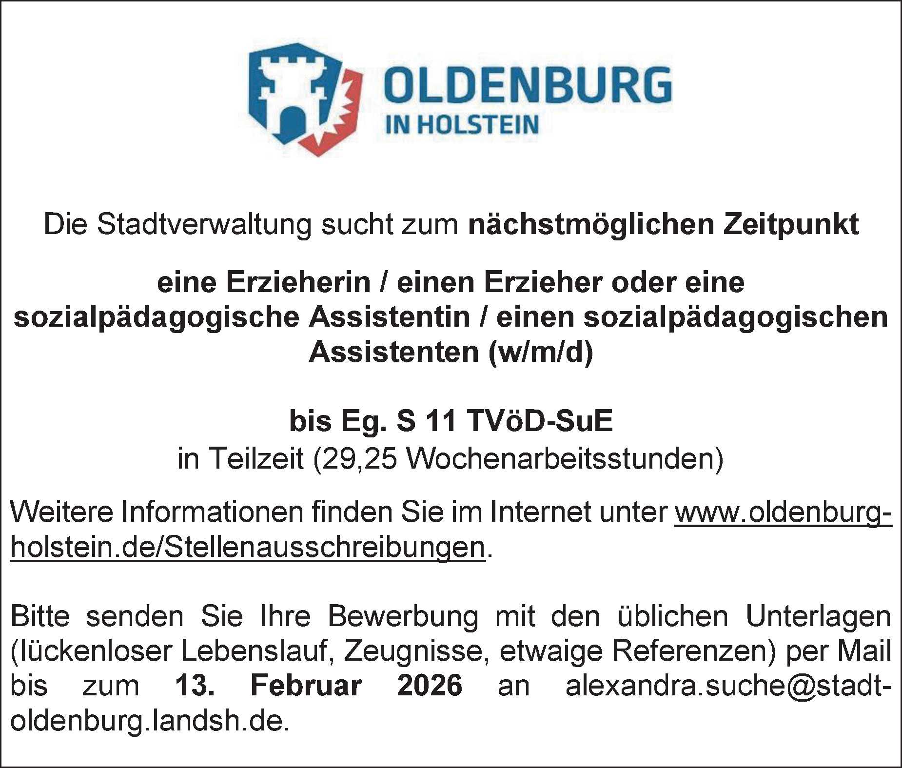 eine Erzieherin / einen Erzieher oder sozialpädagogische Assistent/in in Oldenburg in Holstein Stadtverwaltung Oldenb urg in Holstein Anzeige vom 28.01.2026