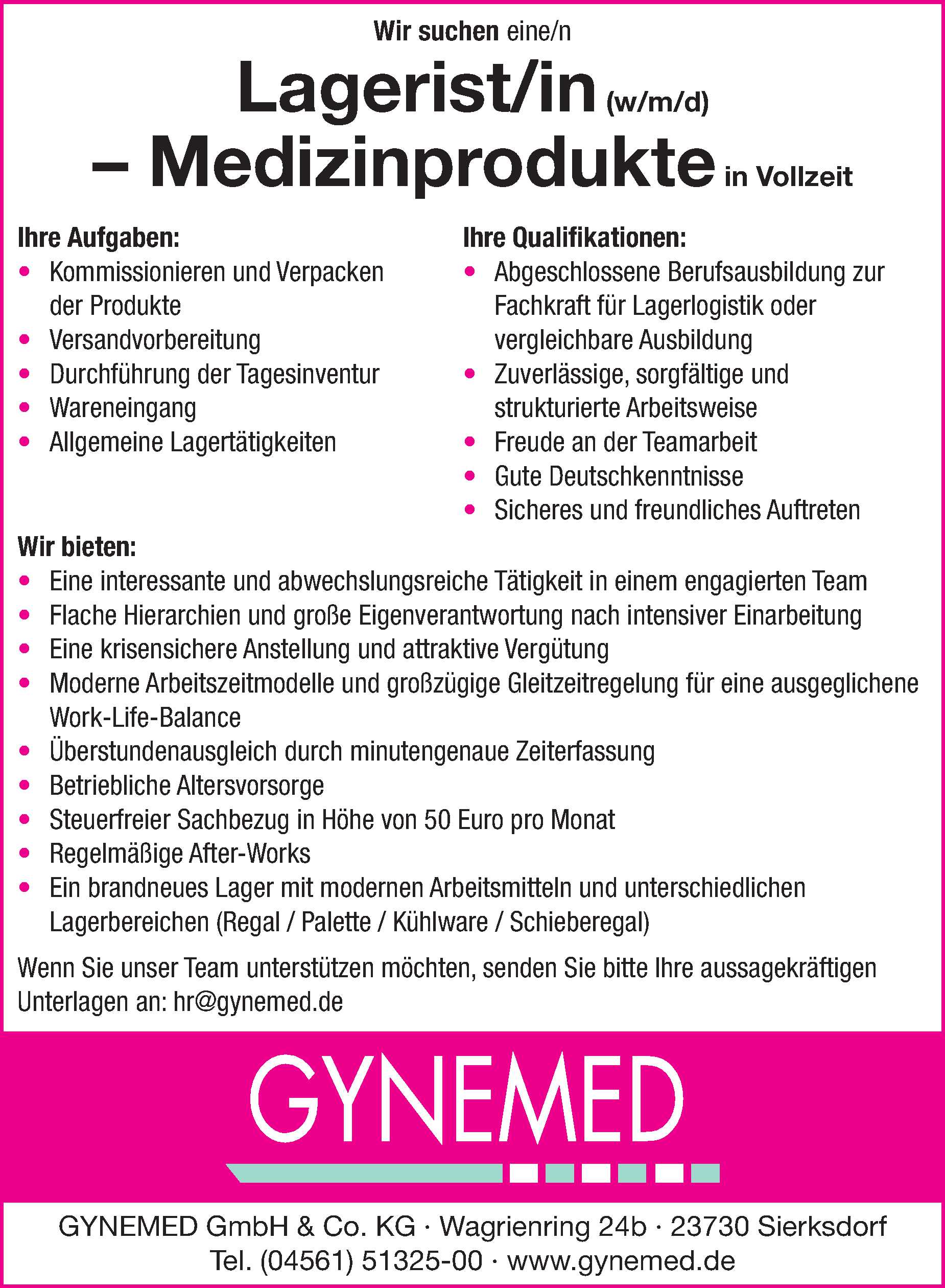 Lageristen/innen (w/m/d) - Medizinprodukte in Sierksdorf GYNEMED GmbH & Co. KG Anzeige vom 31.01.2026