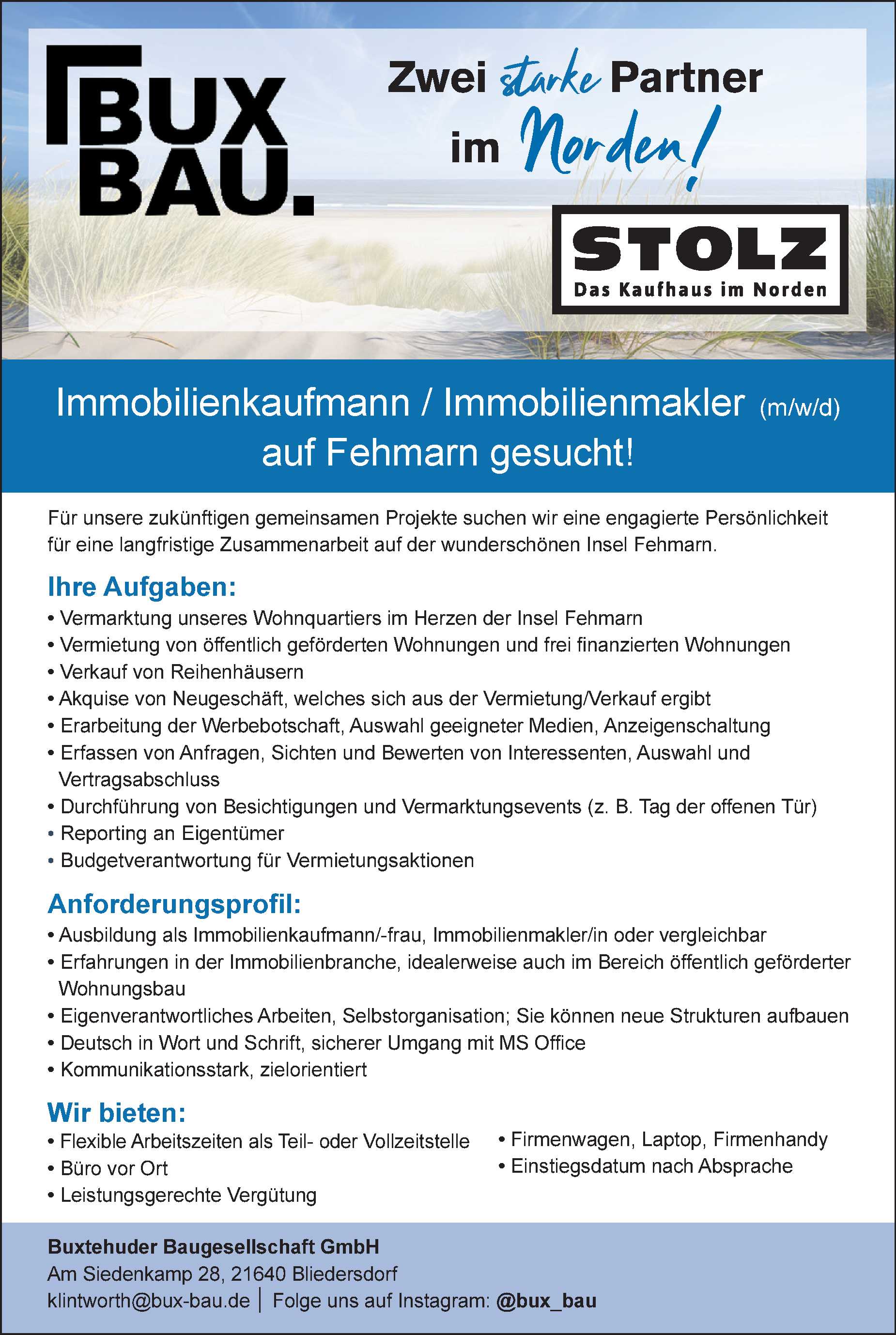 Immobilienkaufmann/Immobilienmakler m/w/d auf Fehmarn gesucht in Bliedersdorf Buxtehuder Baugesellschaft GmbH Anzeige vom 04.04.2026