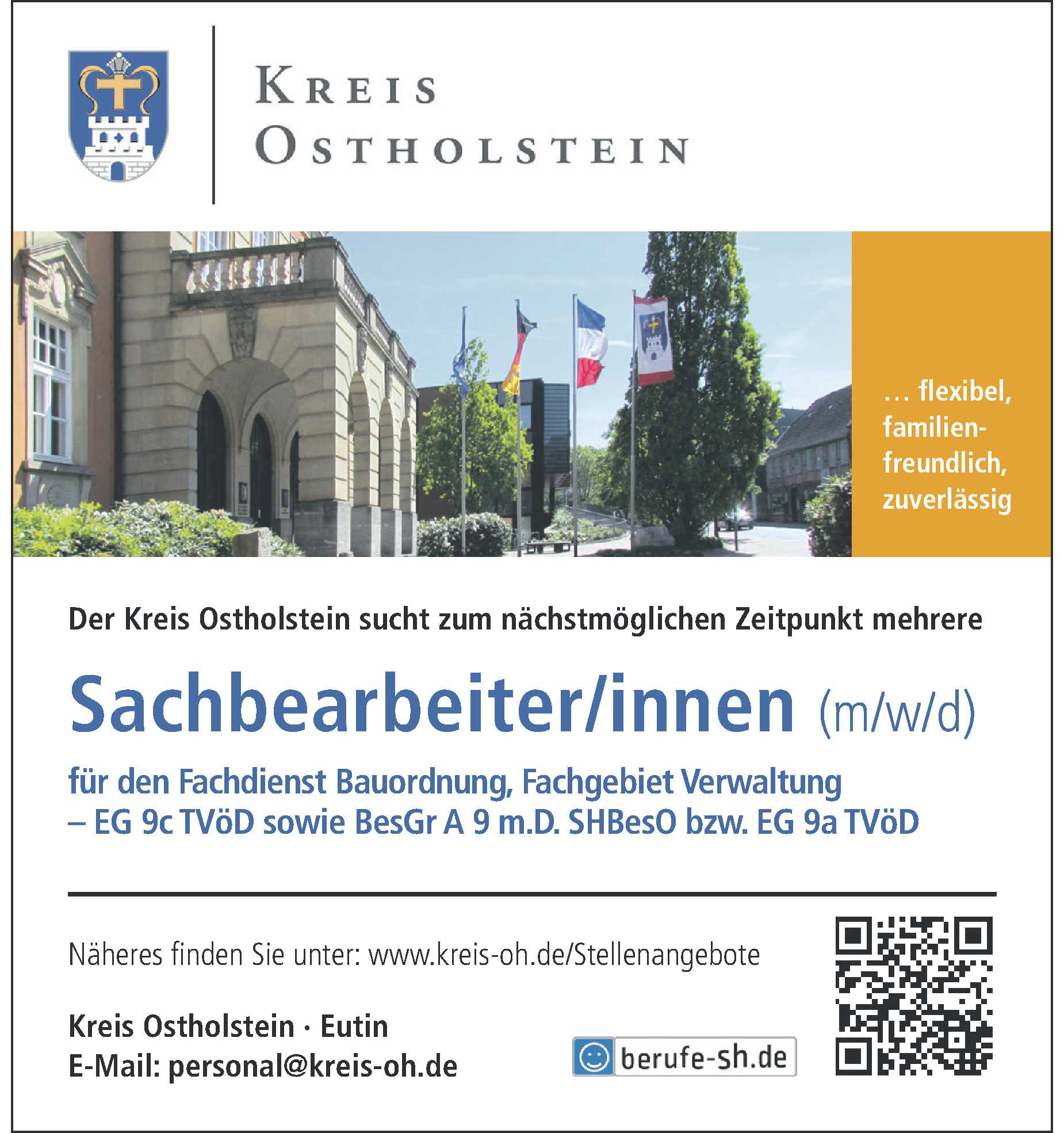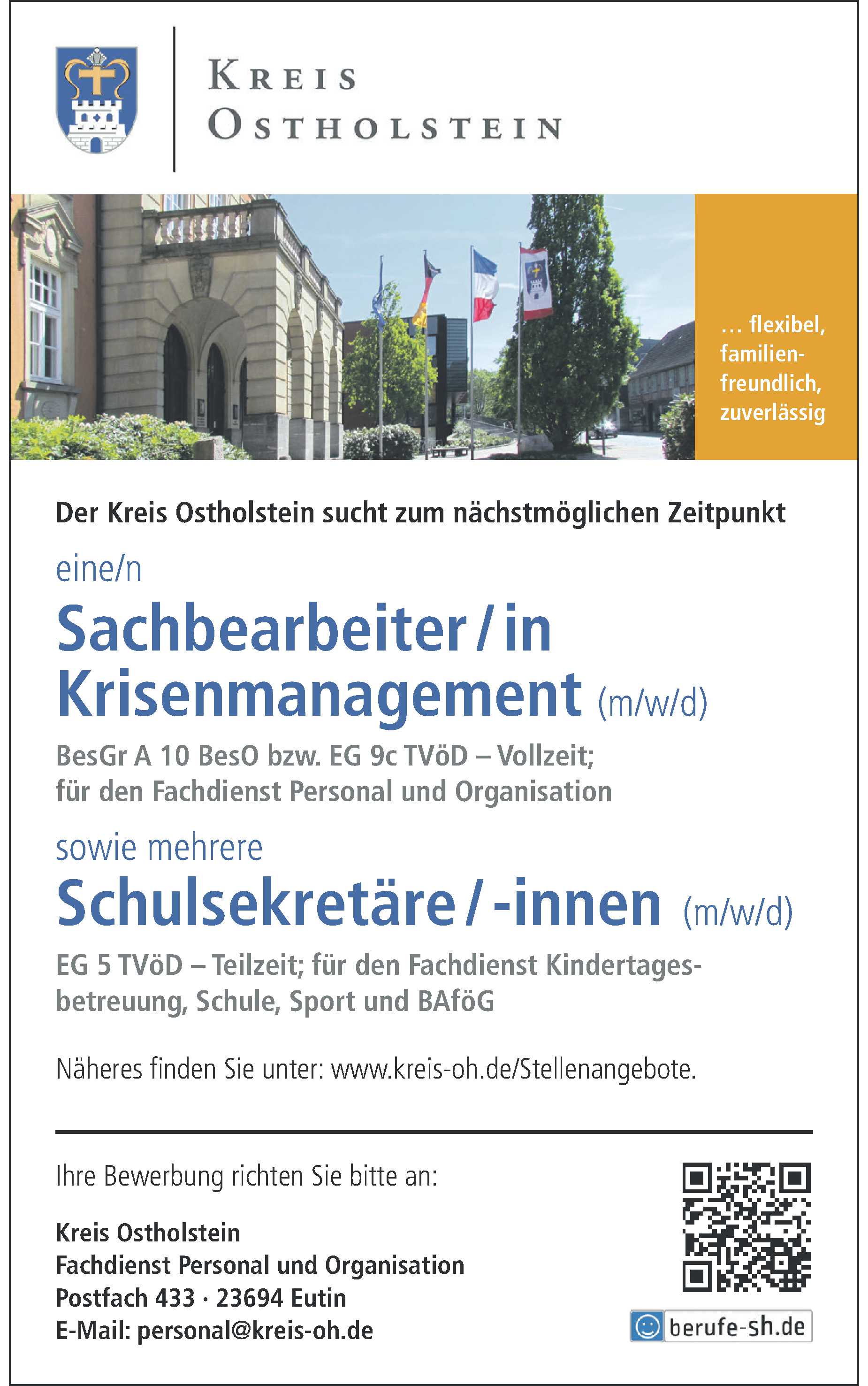 Sachbearbeiter / in Krisenmanagement (m/w/d); Schulsekretäre / -innen (m/w/d) Kreis Ostholstein Anzeige vom 08.04.2026