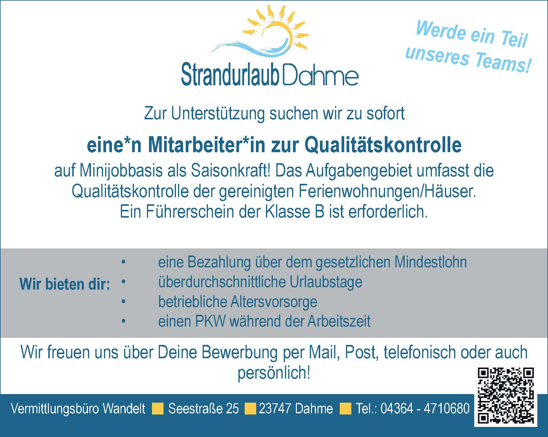 eine*n Mitarbeiter*in zur Qualitätskontrolle in Dahme Vermittlungsbüro Wandelt Anzeige vom 08.04.2026