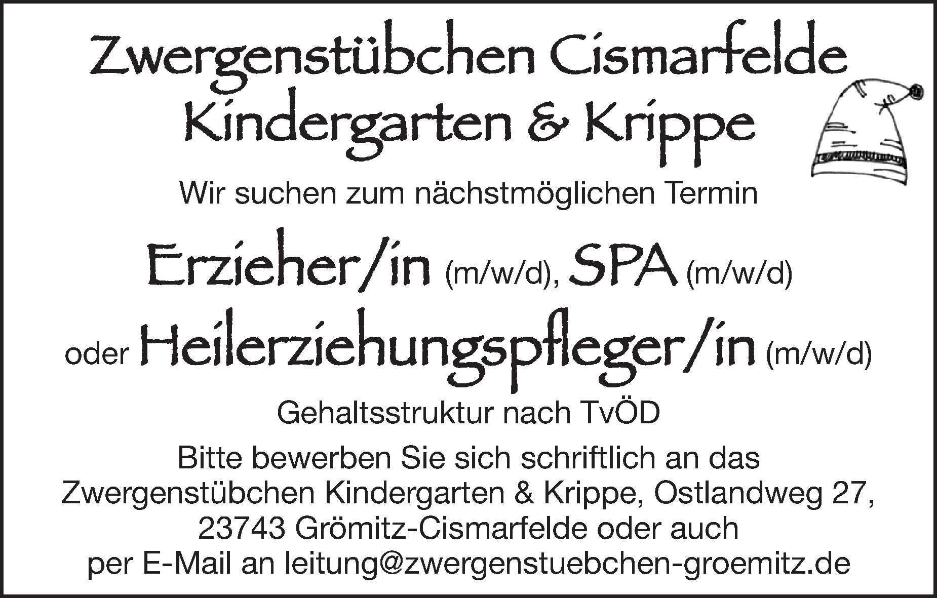 Erzieher/in (m/w/d) & SPA (m/w/d) & Heilerziehungspfleger/in (m/w/d) in Grömitz-Cismarfelde Zwergenstübchen Cismarfelde Anzeige vom 04.04.2026