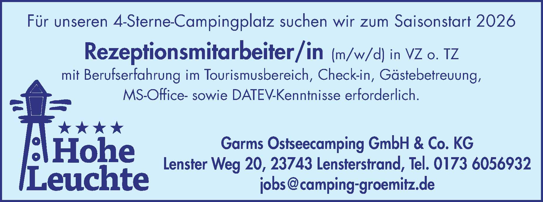 Mitarbeiter für Rezeption m/w/d in Grömitz Campingplatz Hohe Leuchte / Campingplatz Mare Anzeige vom 04.04.2026