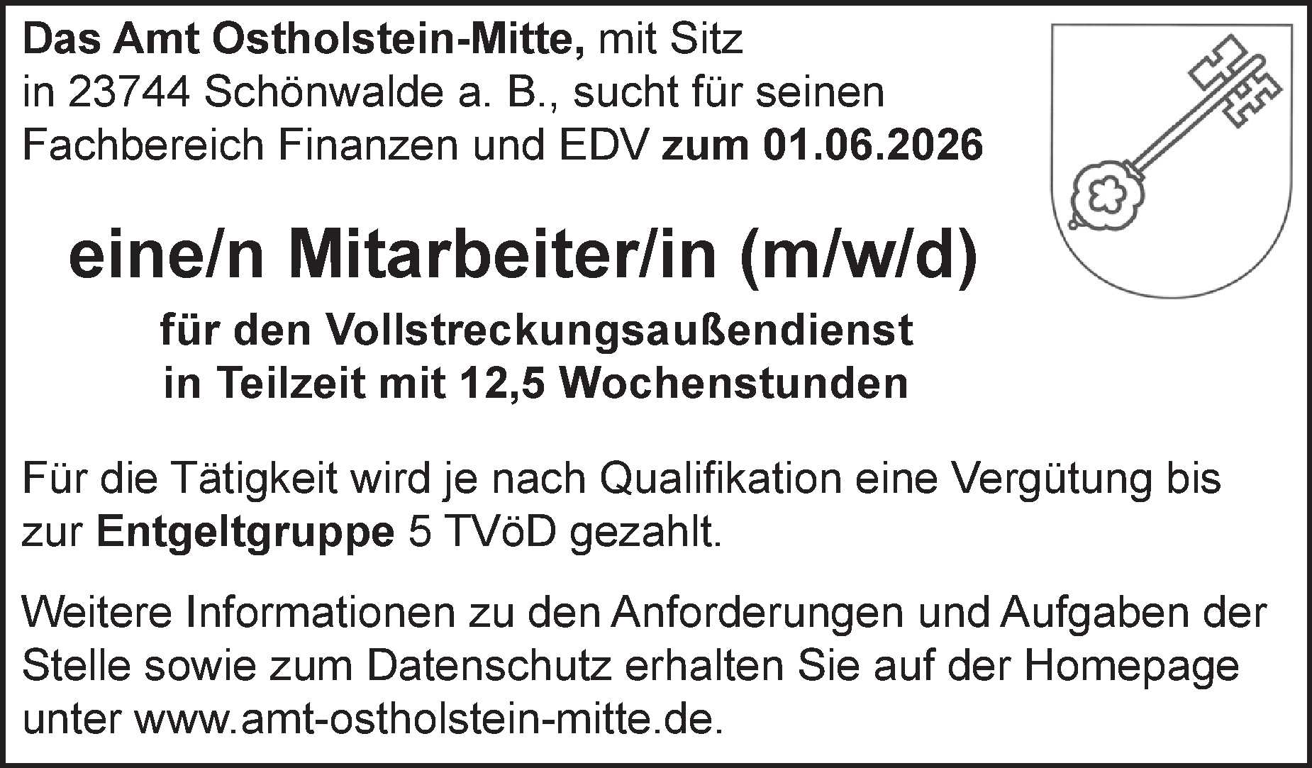 Mitarbeiter/in (m/w/d) für den Vollstreckungsaußendienst Amt Ostholstein-Mitte Anzeige vom 08.04.2026
