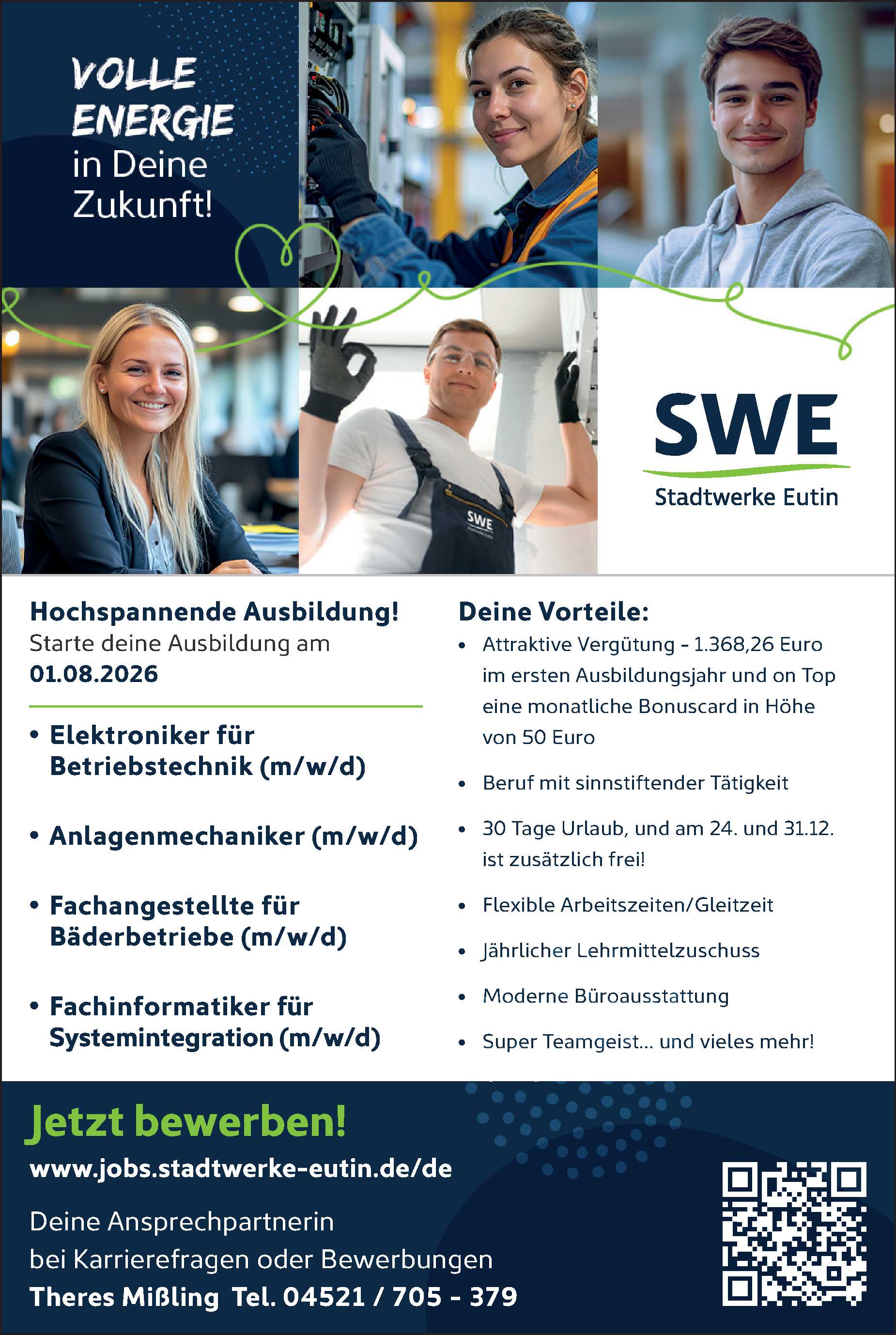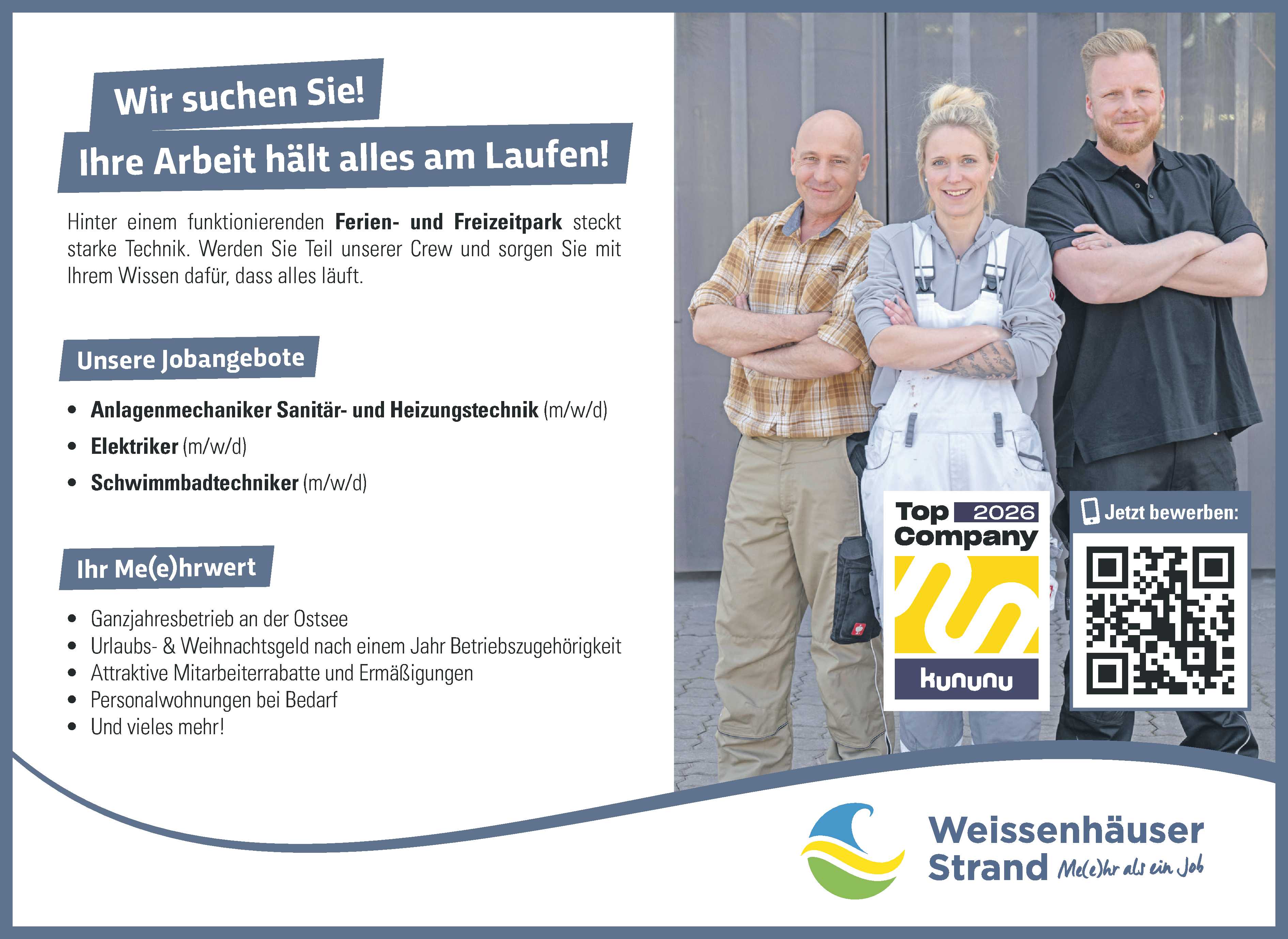 • Anlagenmechaniker S.- u. H.-technik (m/w/d), • Elektriker (m/w/d), • Schwimmbadtechniker (m/w/d) Weissenhäuser Strand Anzeige vom 08.04.2026