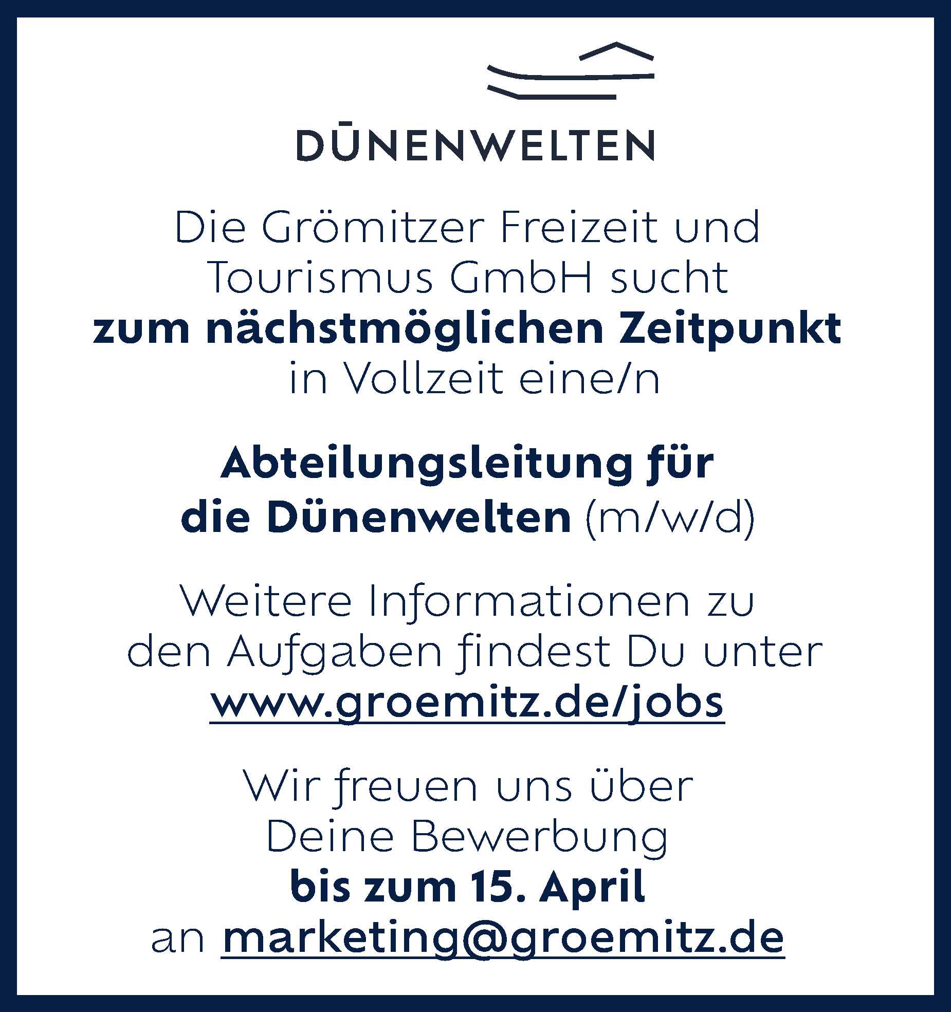 Abteilungsleitung für die Dünenwelten (m/w/d) in Grömitz Grömitzer Freizeit und Tourismus GmbH Anzeige vom 28.03.2026