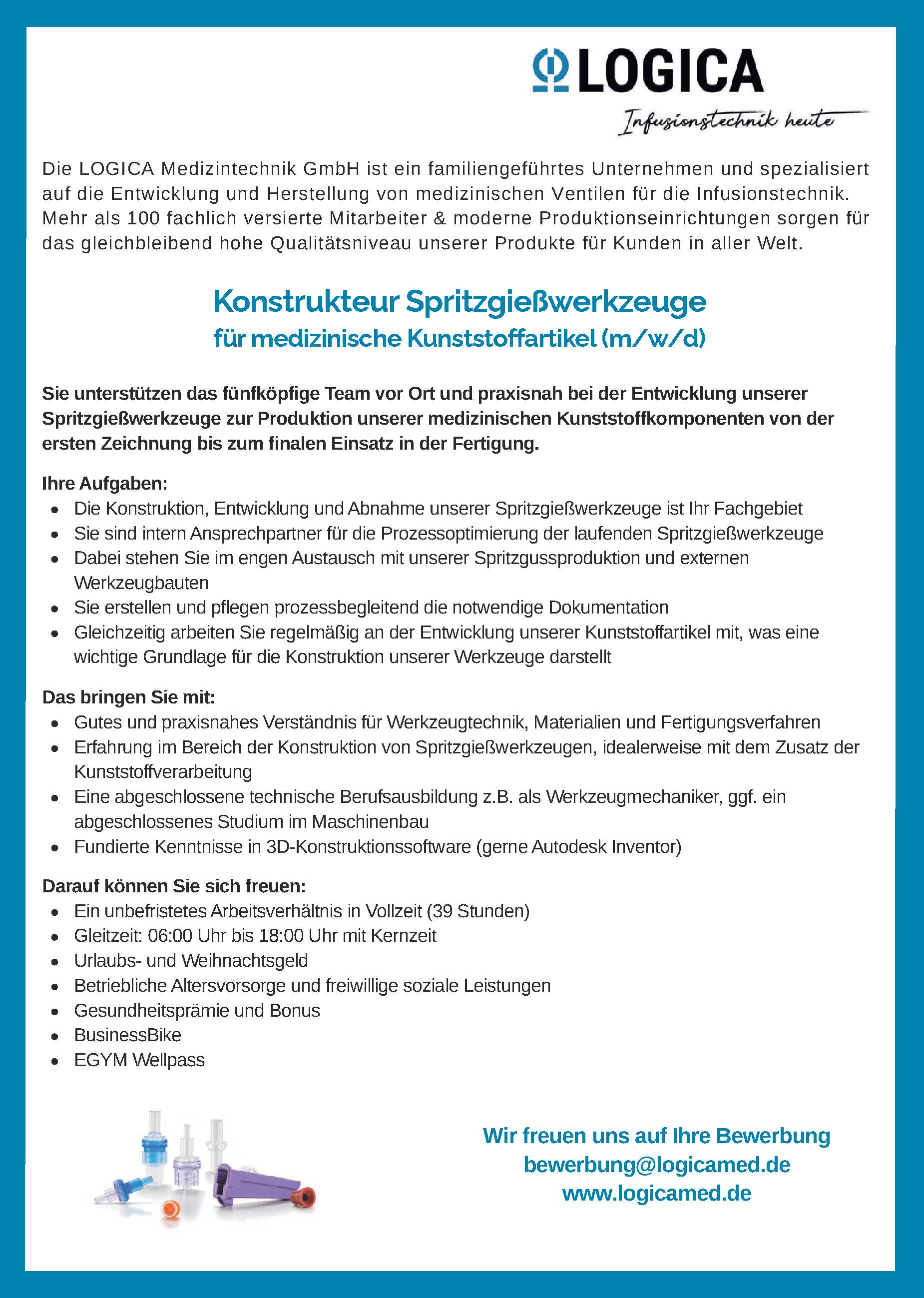 Konstrukteur Spritzgießwerkzeuge für medizinische Kunststoffartikel (m/w/d) Logica Anzeige vom 01.04.2026