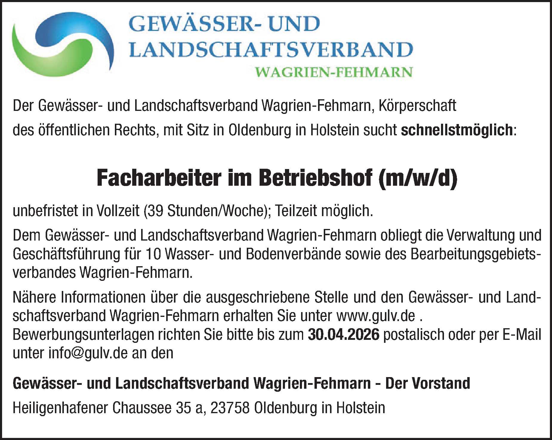 Facharbeiter im Betriebshof (m/w/d) in Oldenburg in Holstein Gewässer- und Landschaftsverband Wagrien-Fehmarn Anzeige vom 01.04.2026