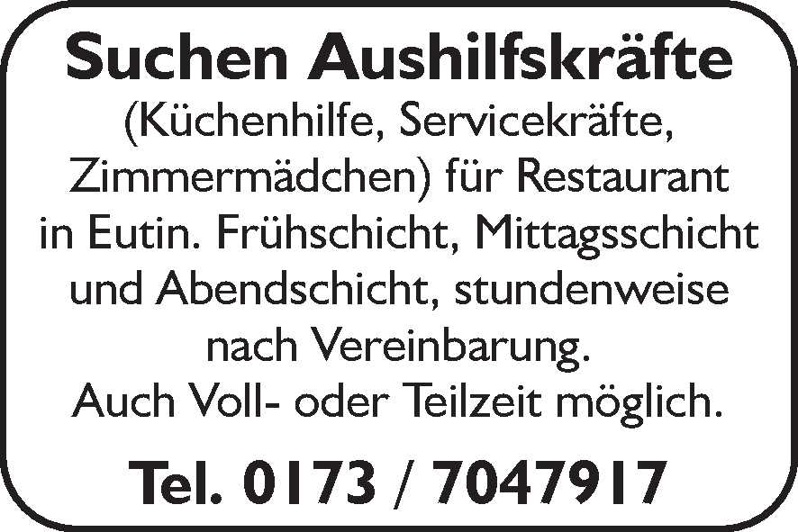 Servicekraft ; Buffet-/Getränkeausgabe ; Koch als Aushilfe ; Spül- und Küchenhilfe (m/w/d) Restaurant Friesenstube Anzeige vom 28.03.2026