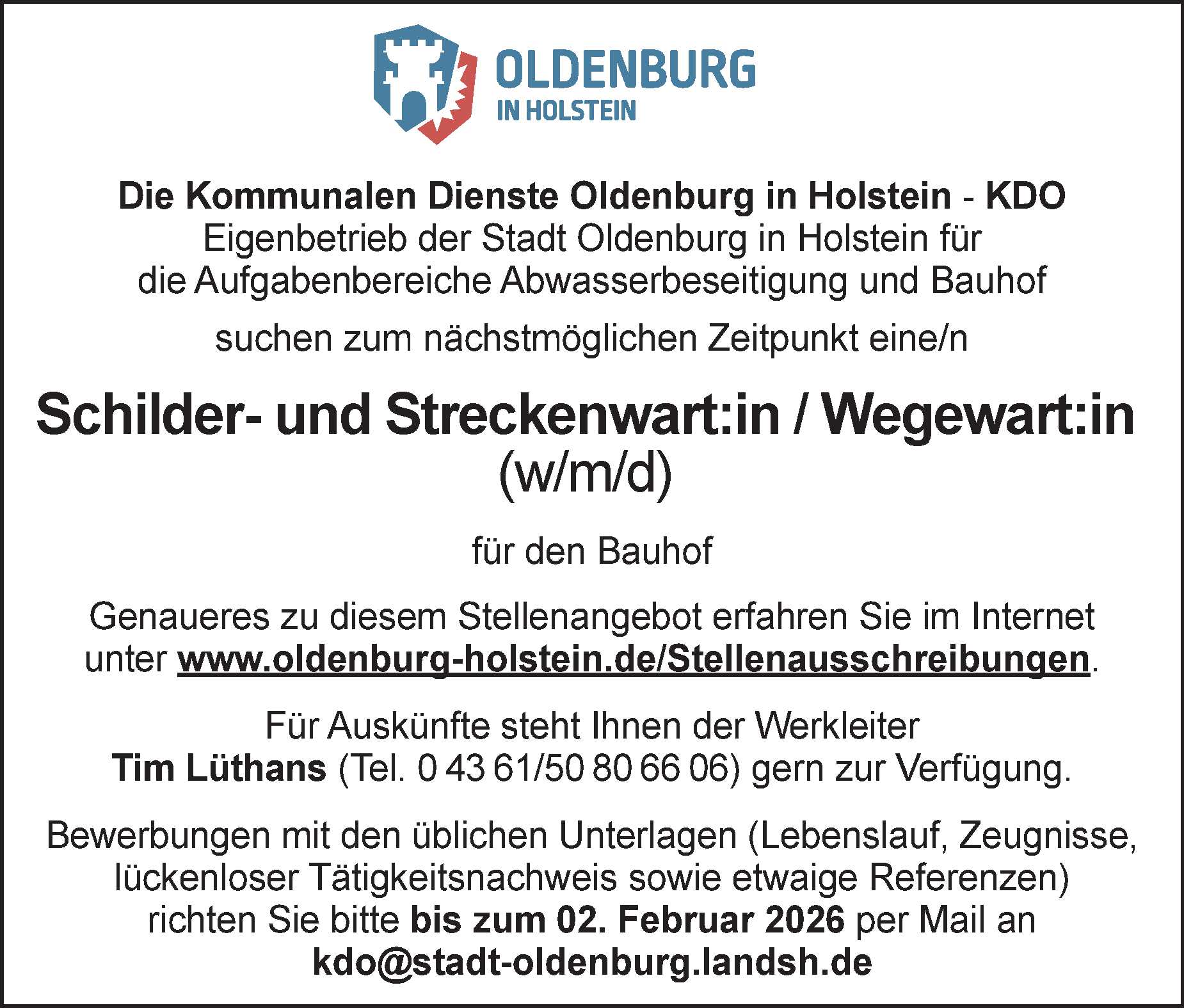 Schilder- und Streckenwart:in / Wegewart:in (m/w/d) fu¨r den Bauhof Stadt Oldenburg Anzeige vom 07.01.2026