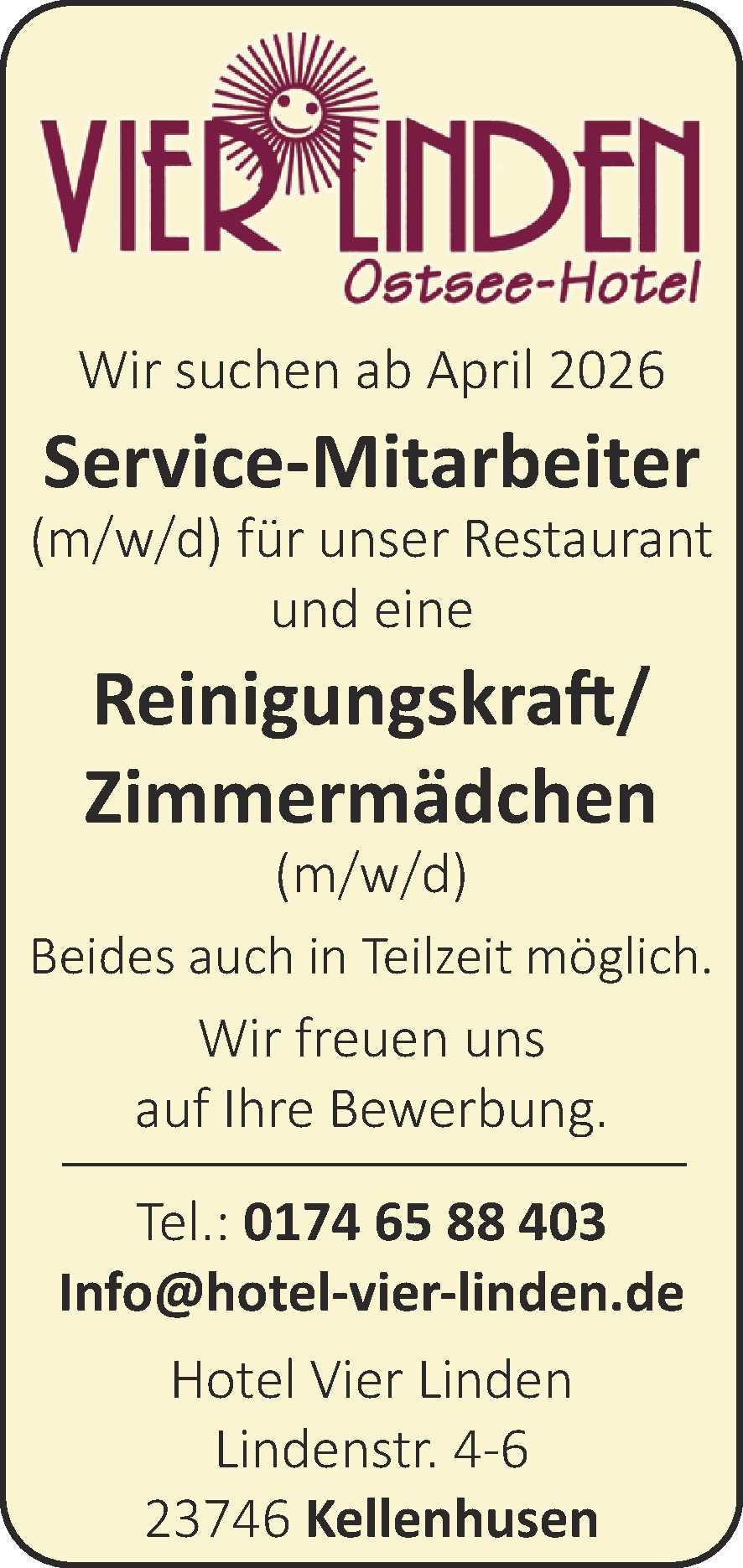 Servicemitarbeiter und Reinigungskraft/Zimmermädchen (m/w/d) in Kellenhusen Hotel Vier Linden Anzeige vom 14.01.2026