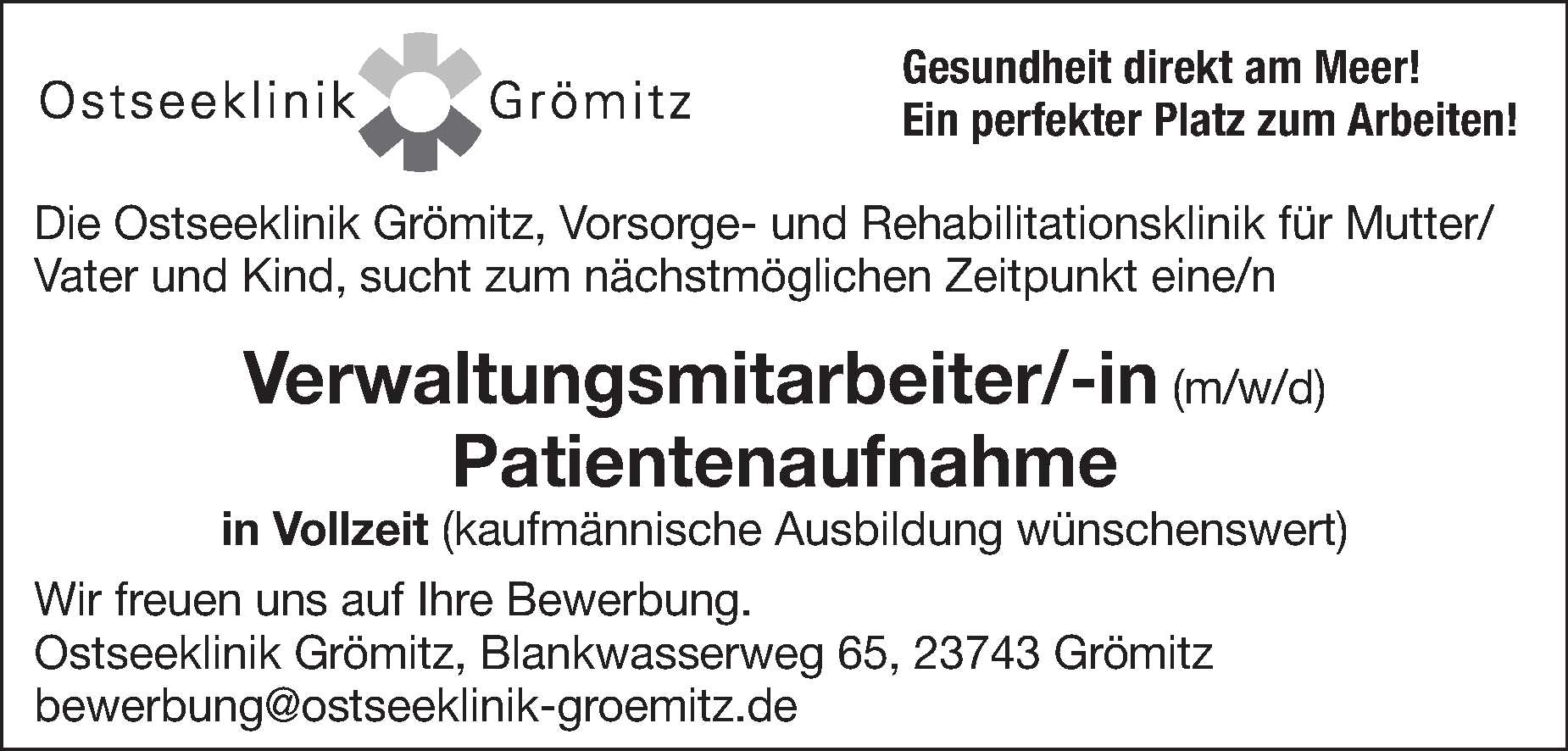 Verwaltungsmitarbeiter-/in Patientenaufnahme (m/w/d) in Vollzeit in Grömitz Ostseeklinik Grömitz Anzeige vom 13.03.2026