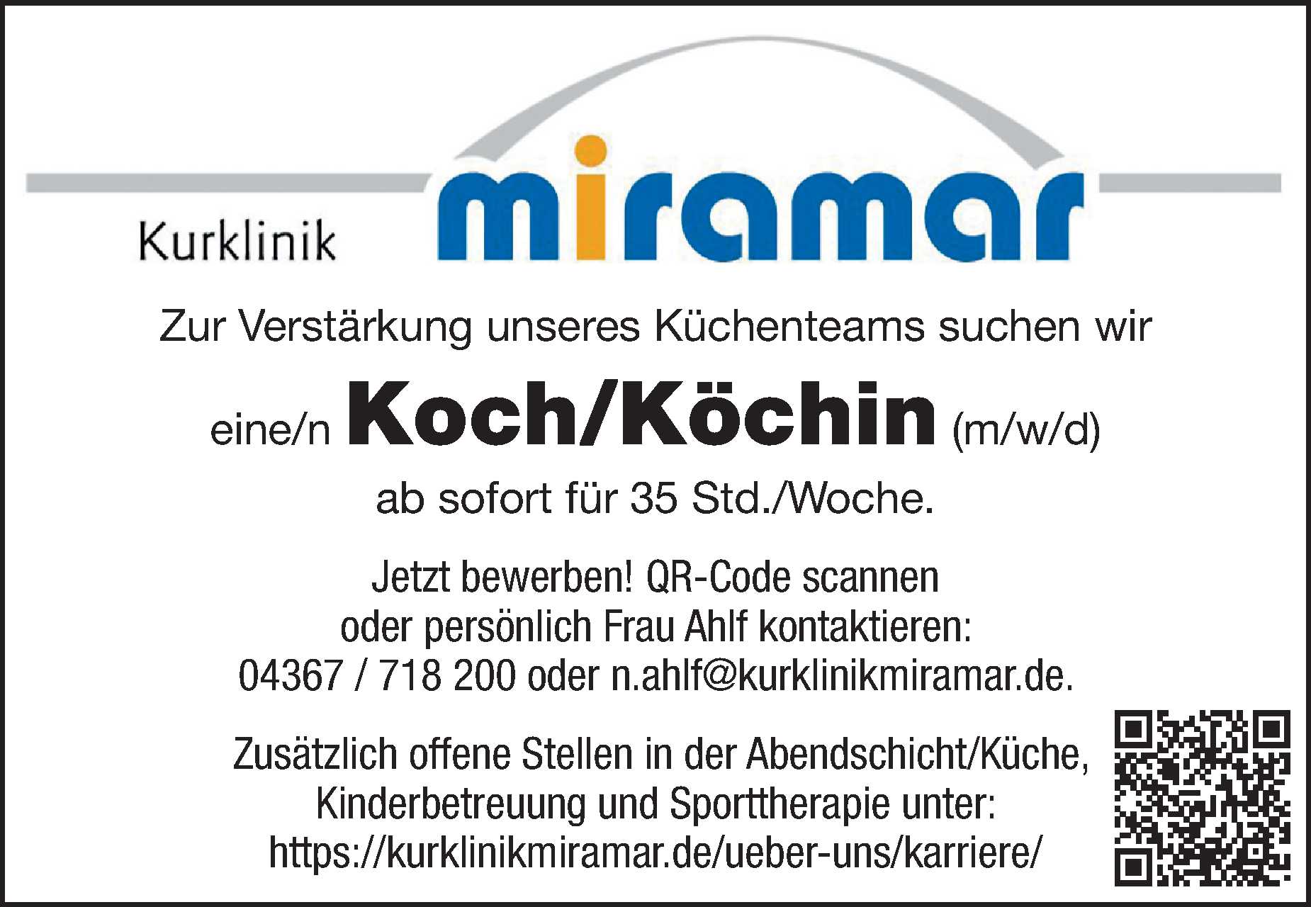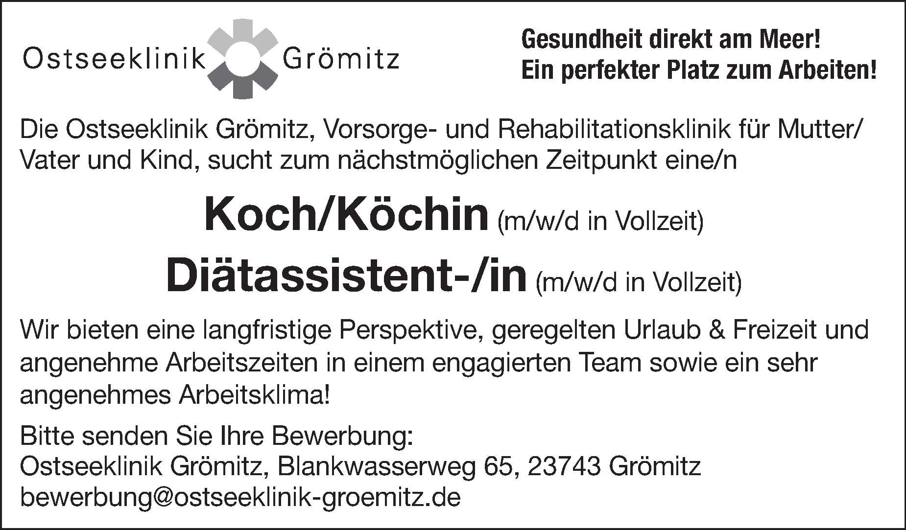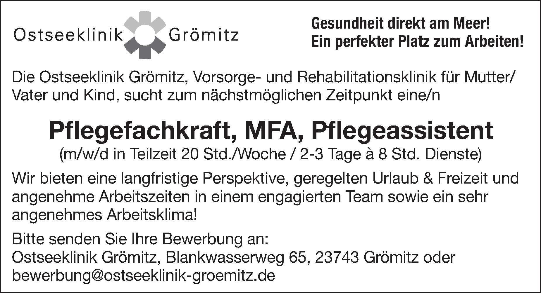 Pflegefachkraft, MFA, Pflegeassistent (m/w/d ) in Grömitz Ostseeklinik Grömitz Anzeige vom 13.03.2026