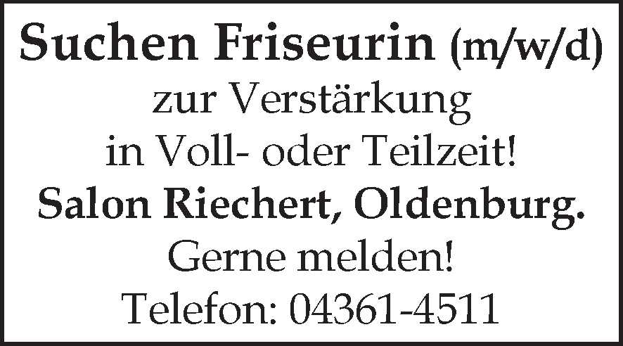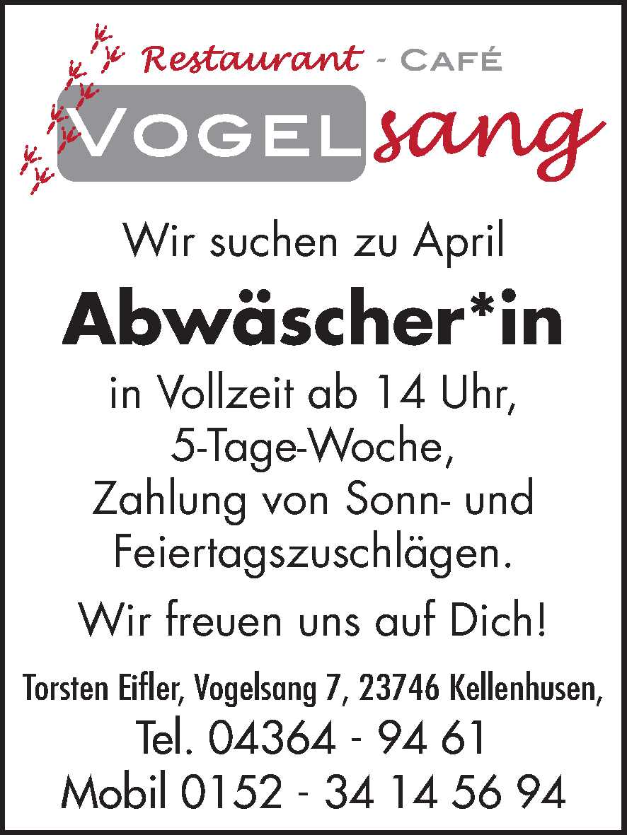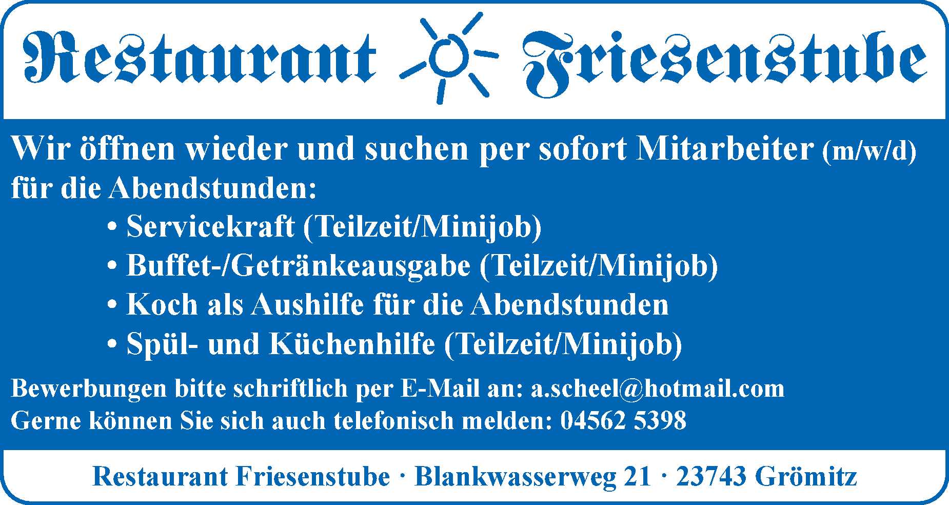 Servicekraft ; Buffet-/Getränkeausgabe ; Koch als Aushilfe ; Spül- und Küchenhilfe (m/w/d) Restaurant Friesenstube Anzeige vom 13.03.2026