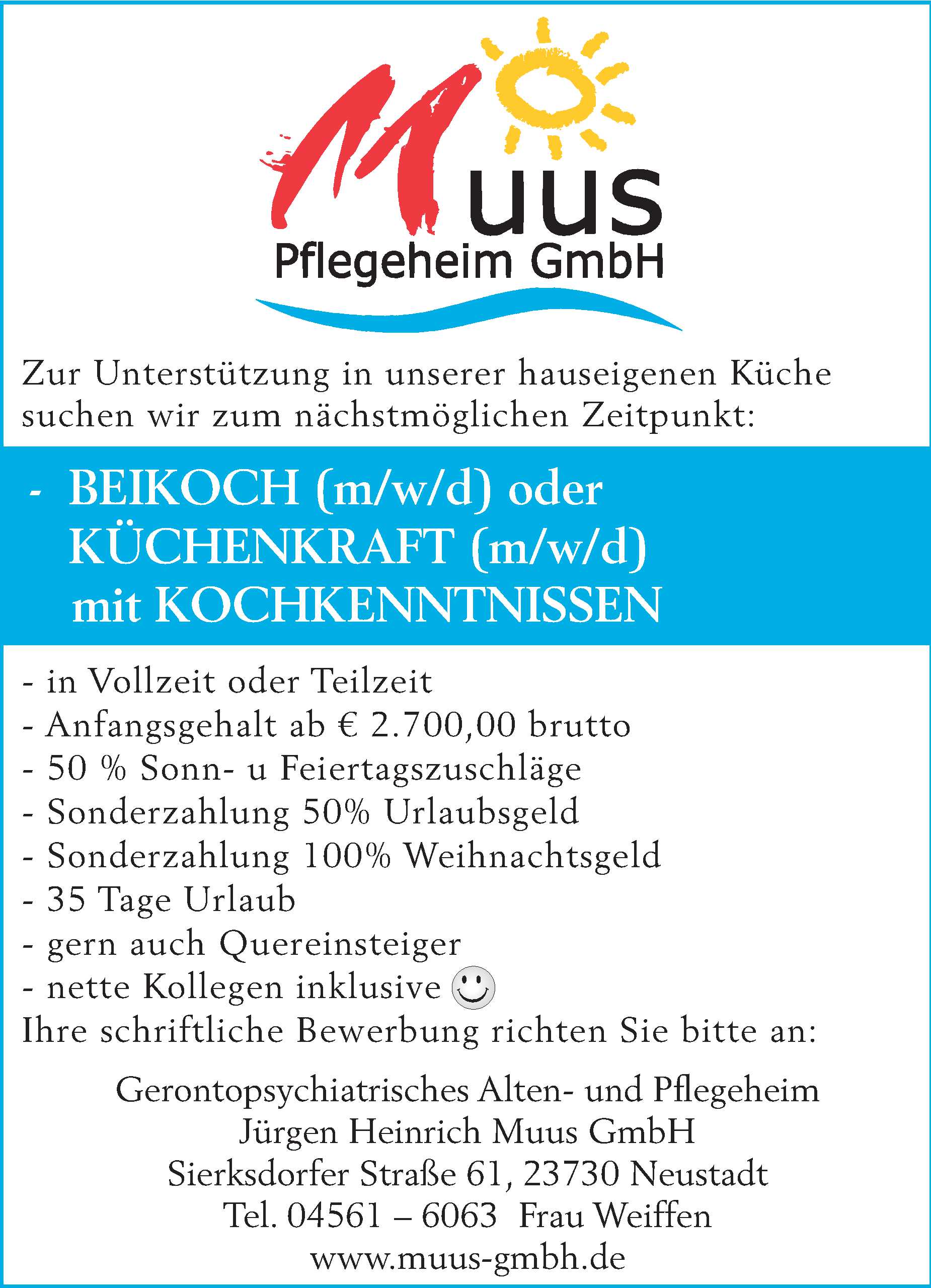 Beikoch oder Küchenkraft mit Kochkenntnissen (m/w/d) in Neustadt in Holstein Gerontopsychiatrisches Alten- und Pflegeheim Jürgen Heinrich Muus GmbH Anzeige vom 07.03.2026