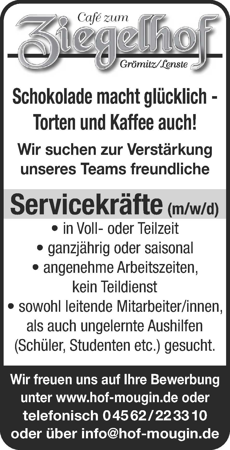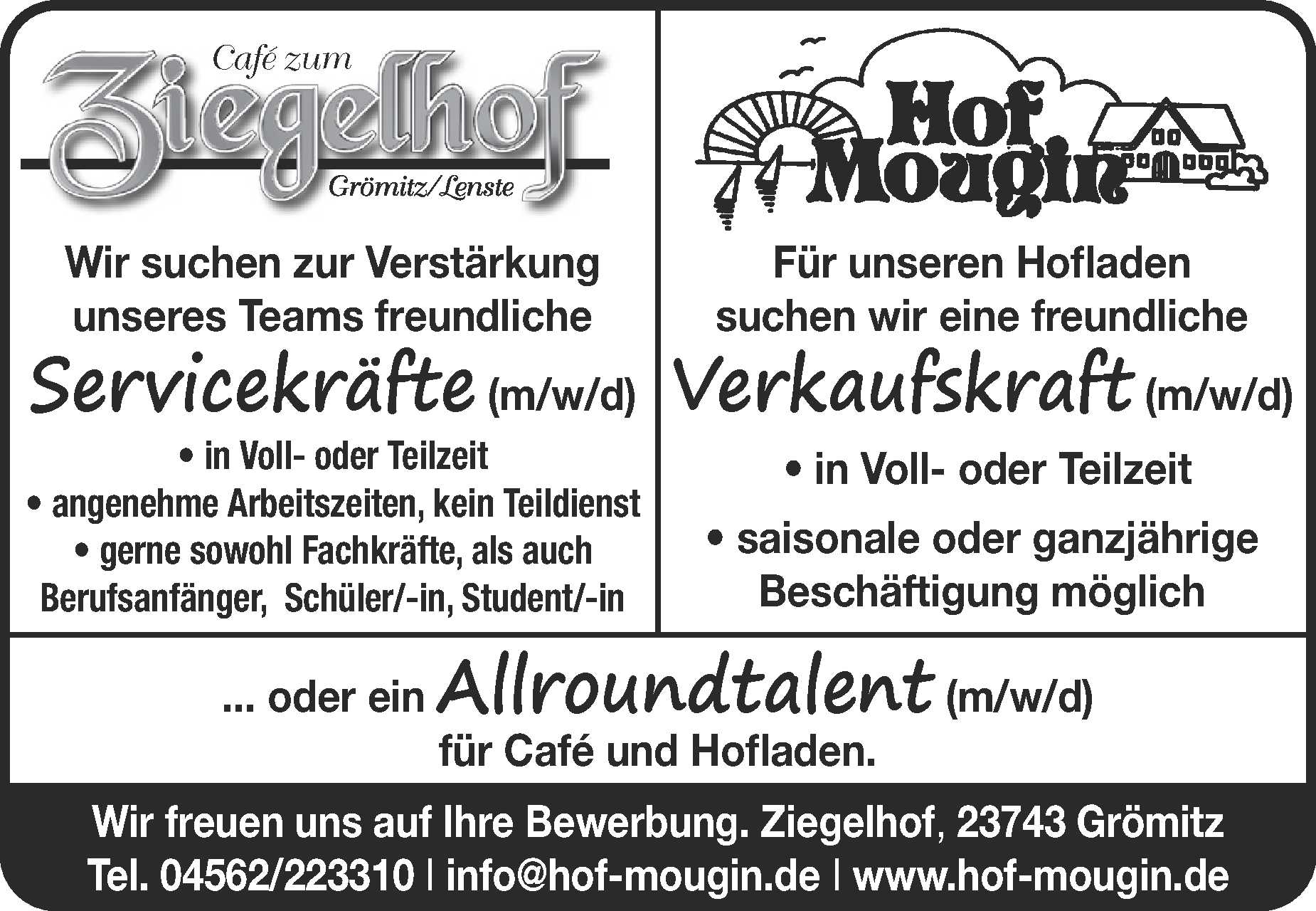 Servicekräfte + Verkaufskraft + Allrountalent (m/w/d) Café zum Ziegelhof / Hof Mougin Anzeige vom 13.03.2026