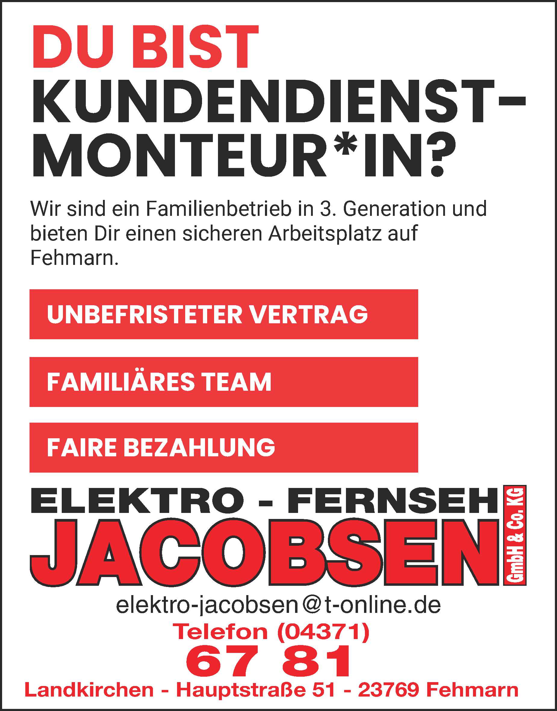 Kundendienstmonteur/in (m/w/d) in Fehmarn Elektro - Fernseh Jacobsen GmbH & Co.KG Anzeige vom 13.03.2026