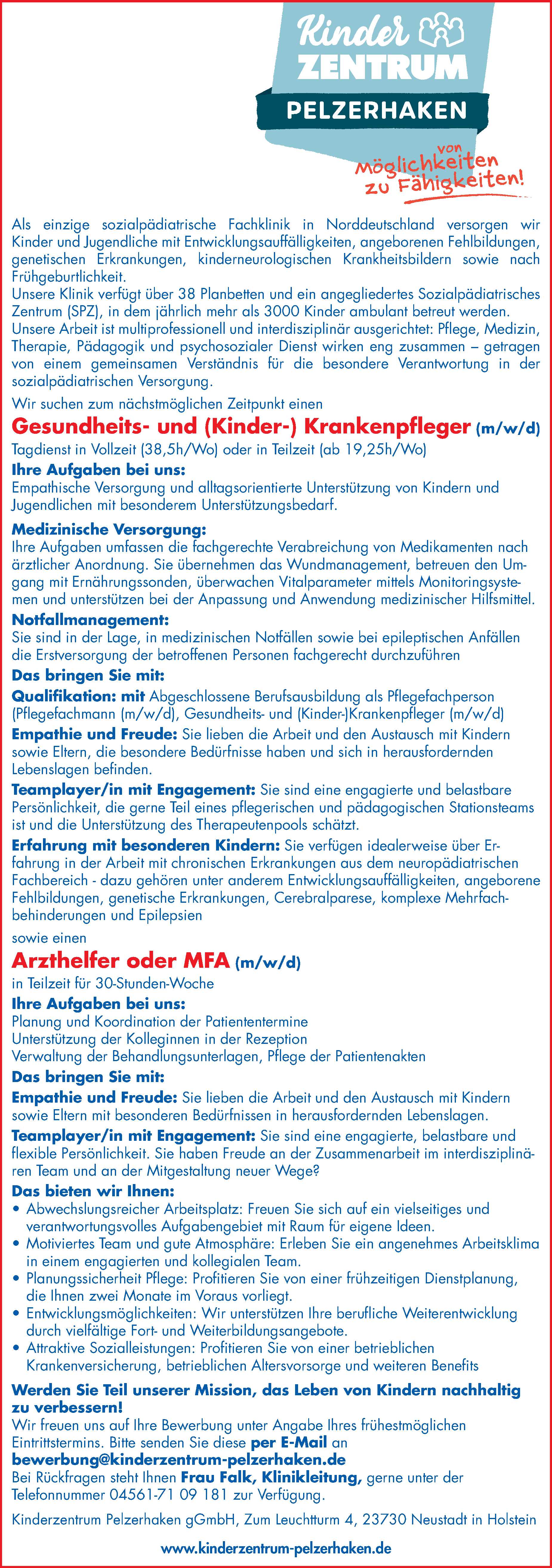 eine/n Arzthelfer oder MFA (m/w/d) ; Gesundheits- und (Kinder-) Krankenpfleger (m/w/d) in Pelzerhaken Kinderzentrum Pelzerhaken Anzeige vom 13.03.2026