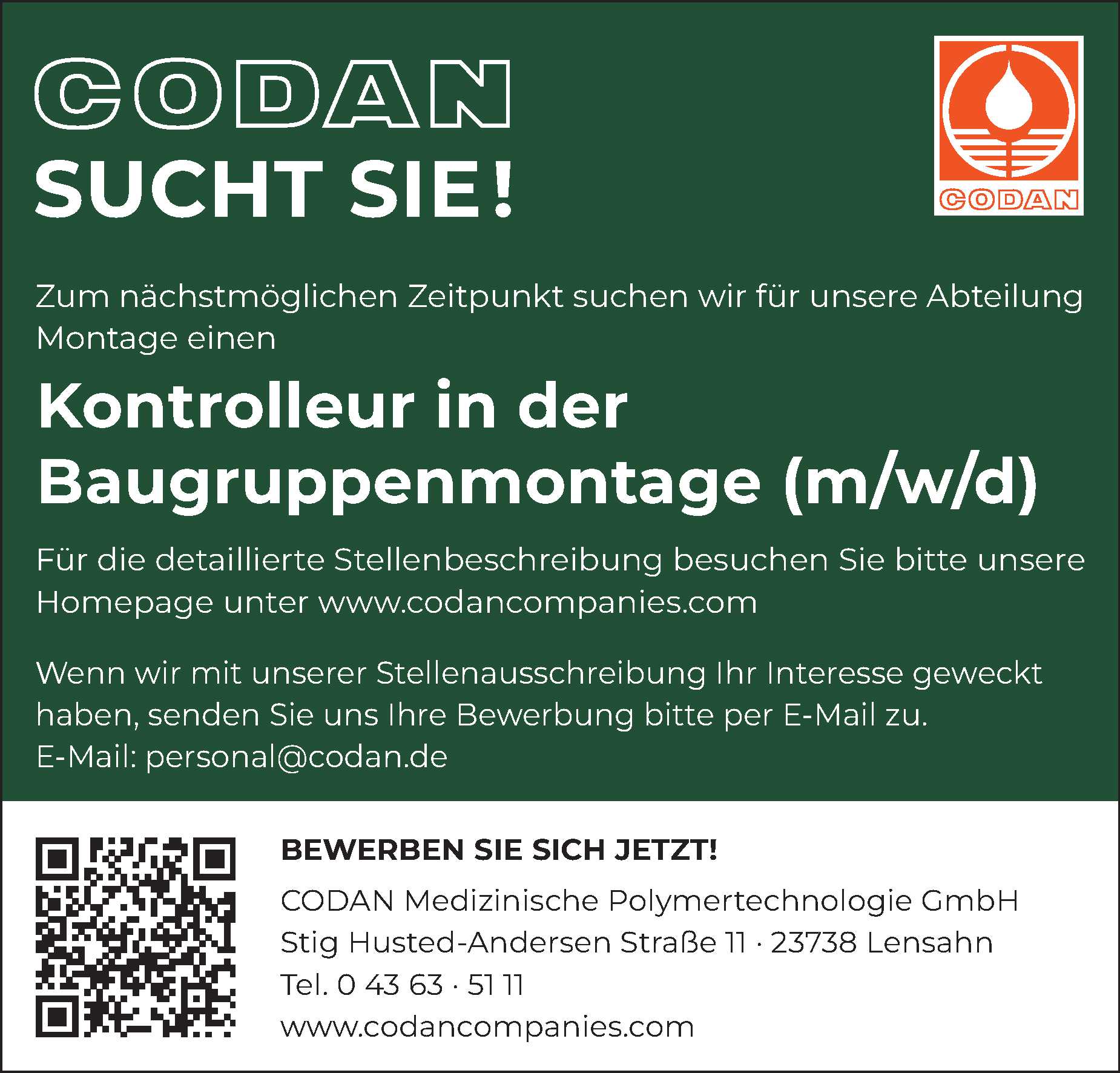 Kontrolleur in der Baugruppenmontage (m/w/d) in Lensahn CODAN Medizinische Polymertechnologie GmbH Anzeige vom 04.03.2026