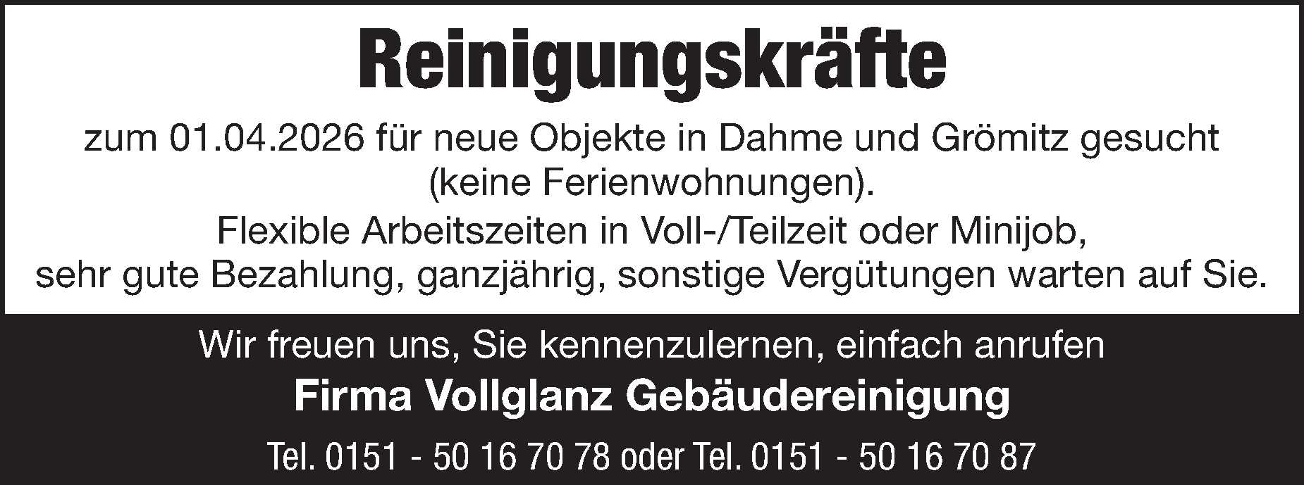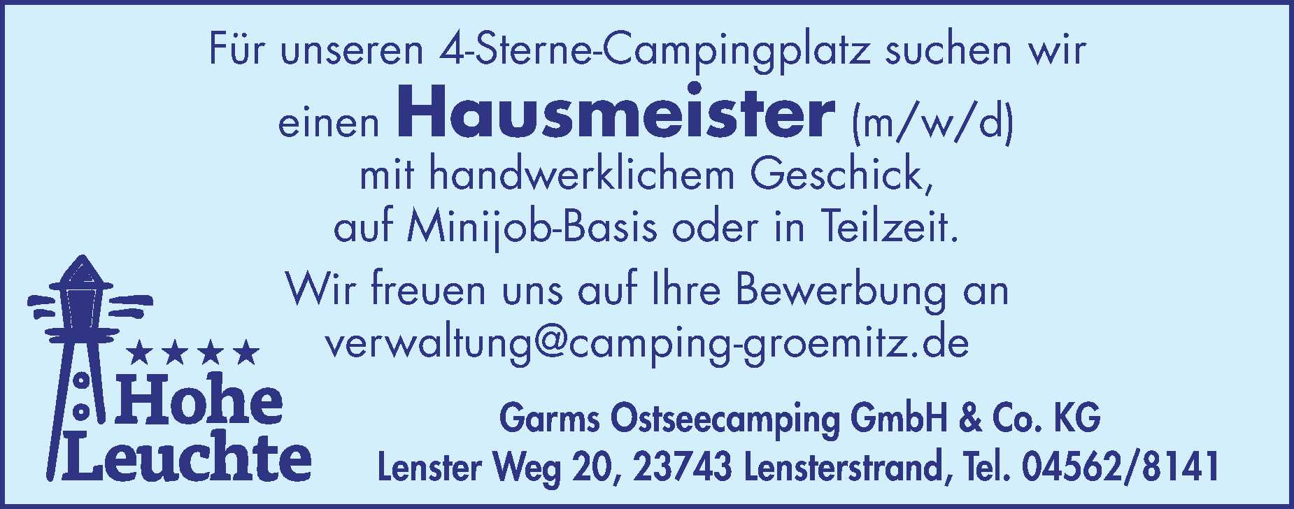 Reinigung + Handwerker + Animation + Rezeption (m/w/d) in Grube Rosenfelder Strand Ostsee Camping Anzeige vom 13.03.2026