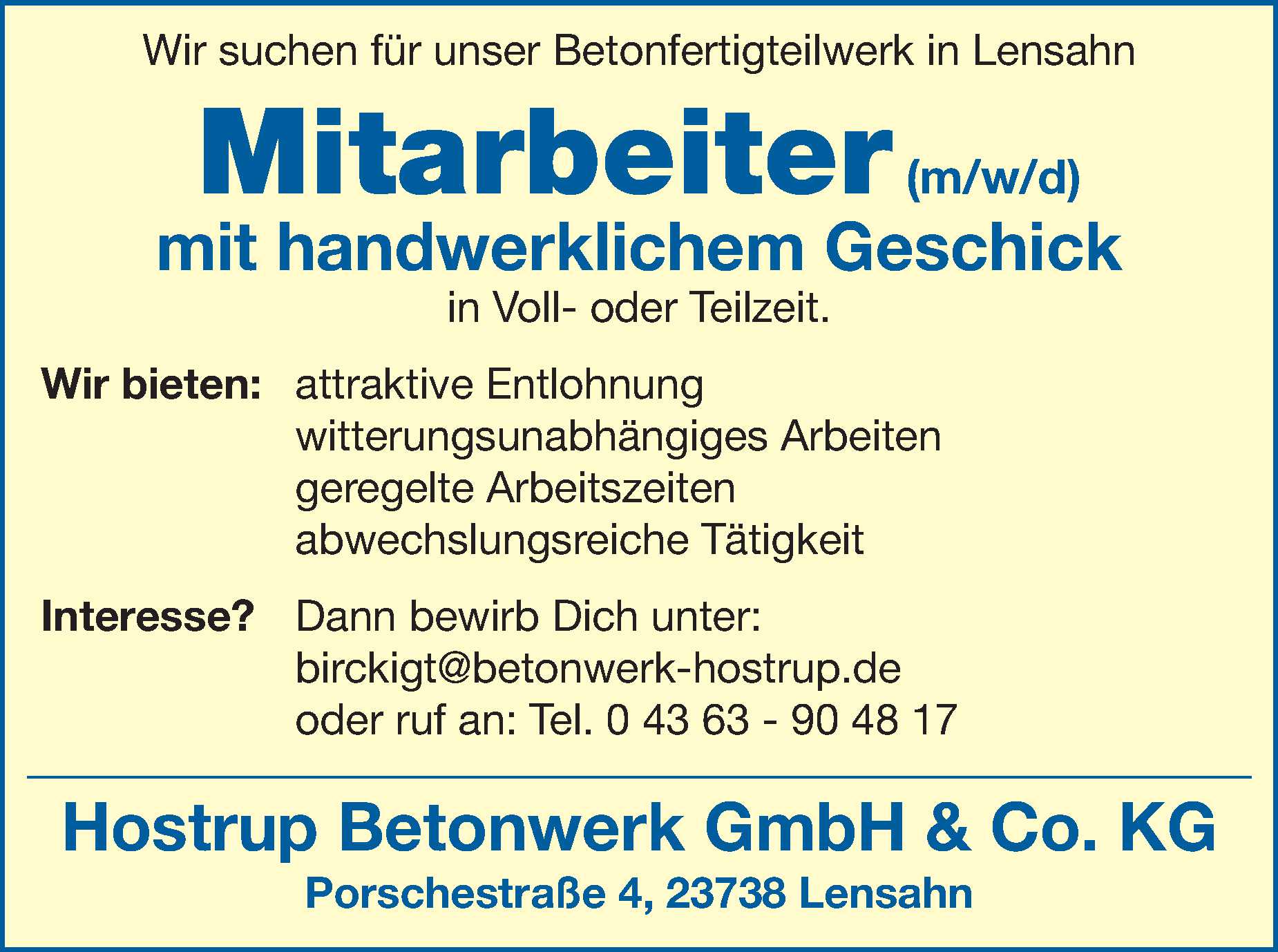 Mitarbeiter mit handwerklichem Geschick (m/w/d) in Lensahn Hostrup Betonwerk GmbH & Co. KG Anzeige vom 04.03.2026
